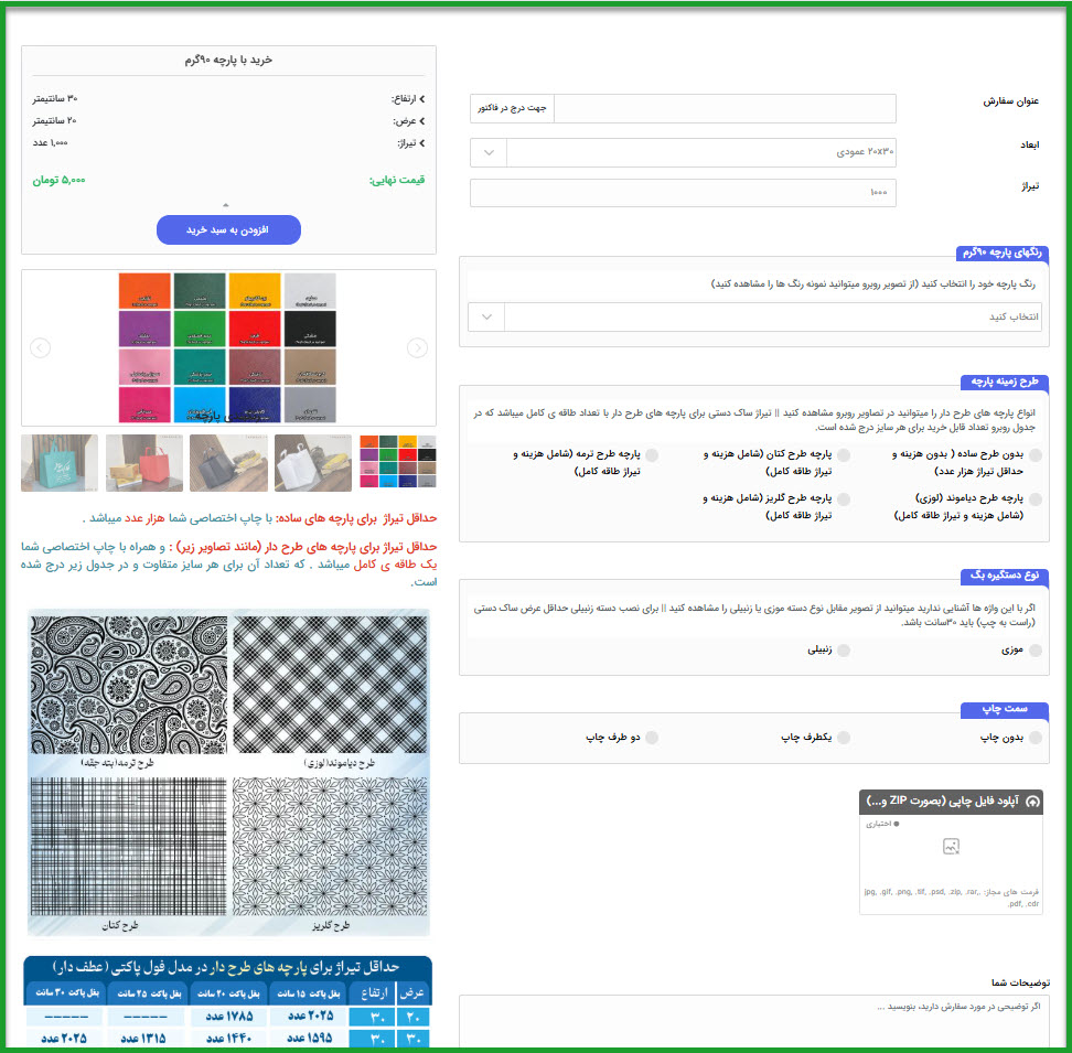 دلخواه پارچه 60 گرم/90گرم/کاغذ رنگ چاپ/رنگ بند/نوع دسته/طرف چاپ 450,000 تومان به ازای هر عدد