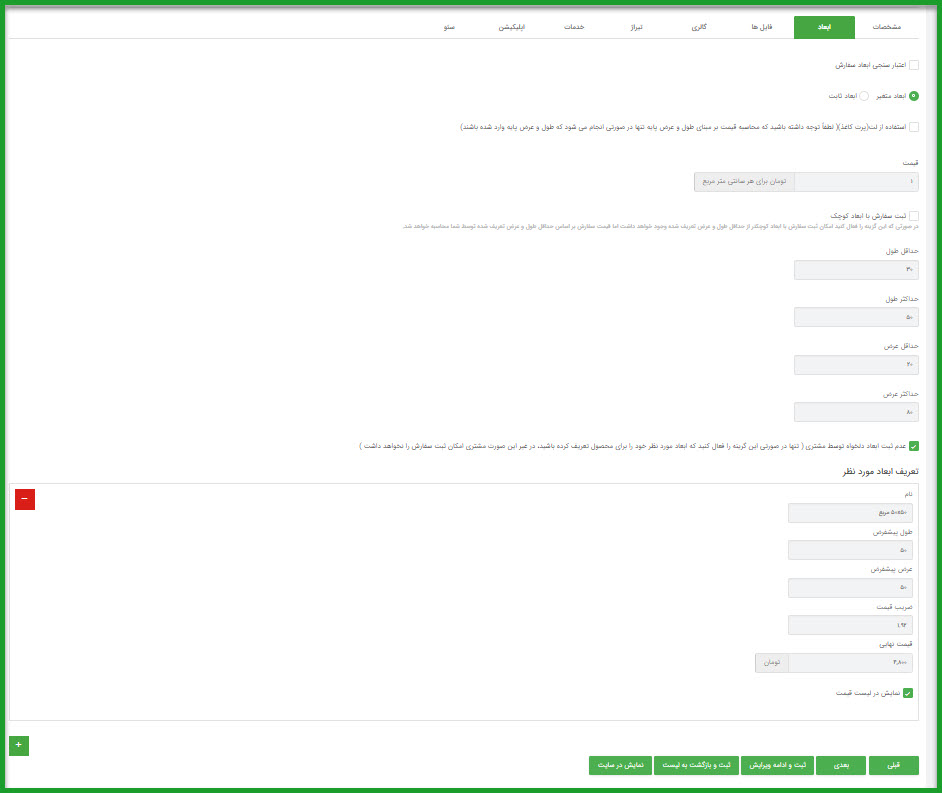 نکته: درصورتی که در چاپخانه شما امکان ثبت سفارش با  ابعاد دلخواه وجود دارد گزینه عدم ثبت ابعاد دلخواه توسط مشتری را غیر فعال کنید.
