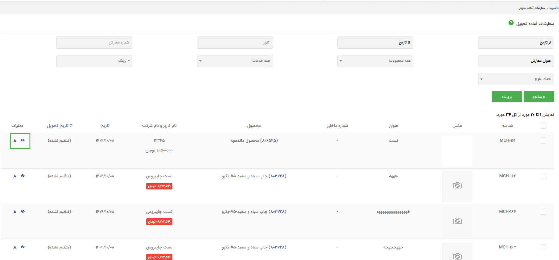 مدیر سایت در قسمت سفارشات چاپی، سفارش مورد نظر را برای چاپ شدن تایید می کند و پس از تایید چاپ می شود و سپس به مرحله آماده تحویل می رود که باید از لیست پایین صفحه وضعیت آماده تحویل را انتخاب و دکمه ذخیره را کلیک کند و یا با استفاده از دکمه چشم و رفتن به صفحه جزئیات سفارش وضعیت سفارش را تغییر دهید: