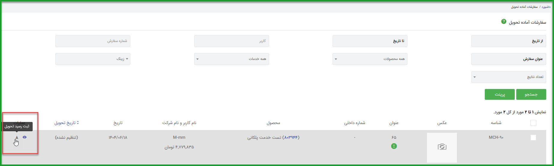 در صفحه سفارشات اماده تحویل ،درستون عملیات بر روی گزینه ثبت رسید تحویل کلیک کنید.