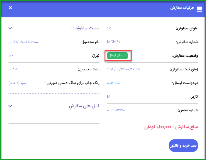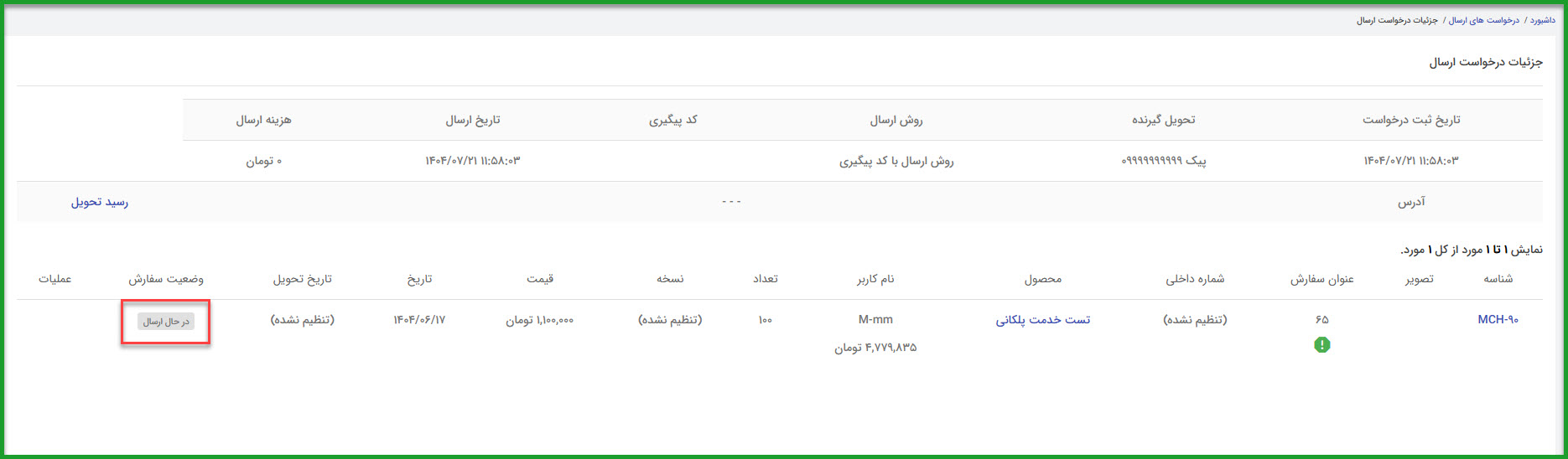 به محض ثبت رسید تحویل، وضعیت سفارش بهصورت خودکار به «در حال ارسال» تغییر میکند.