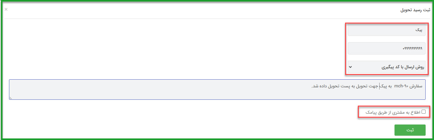 - میتوانید تیک گزینه اطلاع رسانی به مشتری از طریق پیاک را نیز انتخاب کنید تا به مشتری اطلاع رسانی شود.