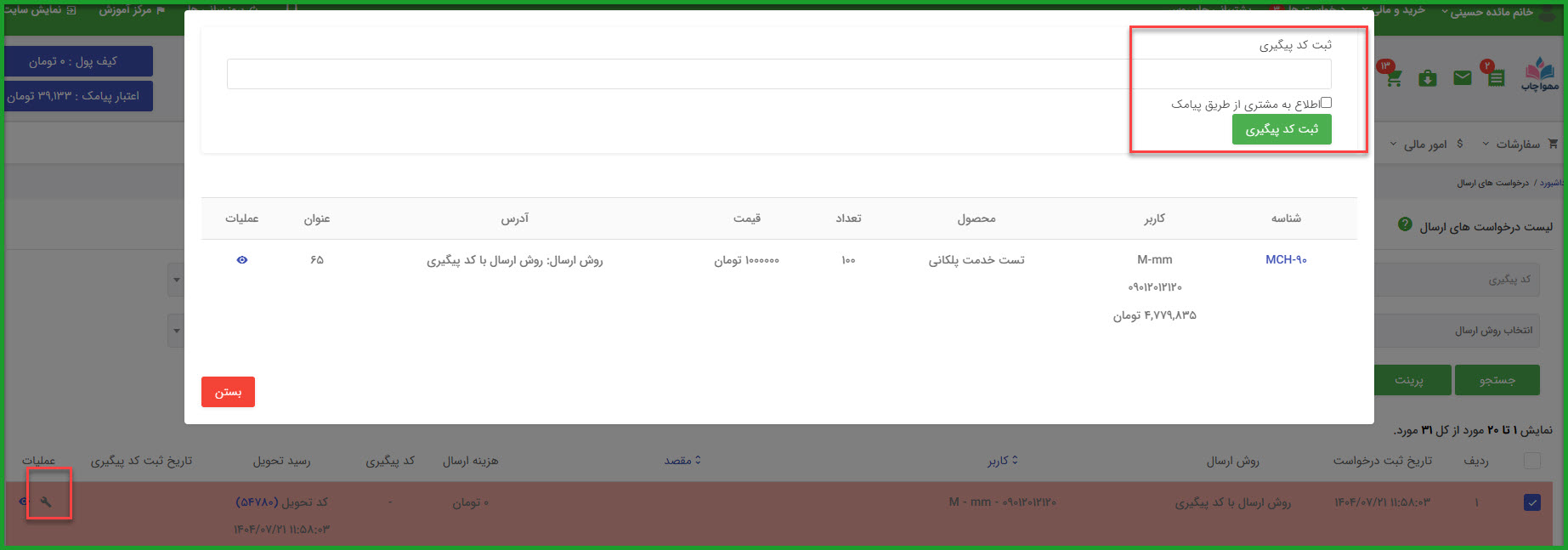 پس از آنکه پیک سفارش را به پست تحویل داد، به بخش سفارشات/درخواست های ارسال بروید و گزینه ثبت کد رهگیری را انتخاب کنید.