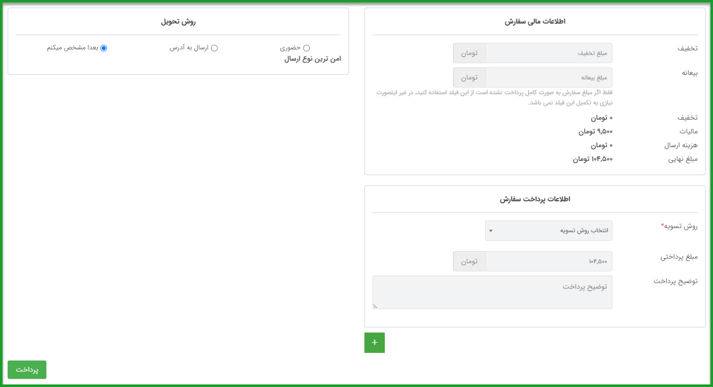 در قسمت اطلاعات مالی سفارش میتوانید تخفیف و بیعانه ای که برای این سفارش یا مشتری در نظر داریدوارد کنید و بعد از وارد کردن مقدار تخفیف در مبلغ نهایی به صورت خودکار اعمال میشود.